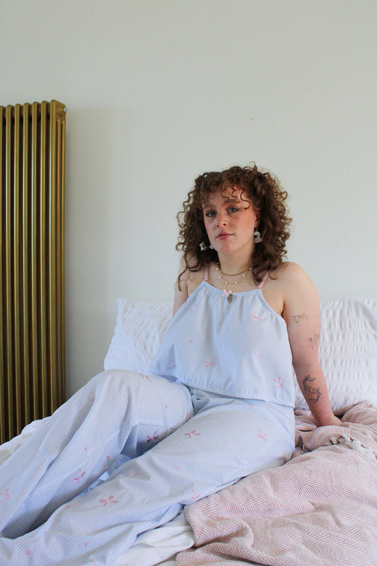 Discover our core, comfy loungewear collection. This fresh blue and white stripe cotton is embroidered with delicate pink bows that dance across the fabric. From breathable PJs to a staple everyday lingerie set and accessory gift sets, this range is perfect for those luxurious, laidback moments.