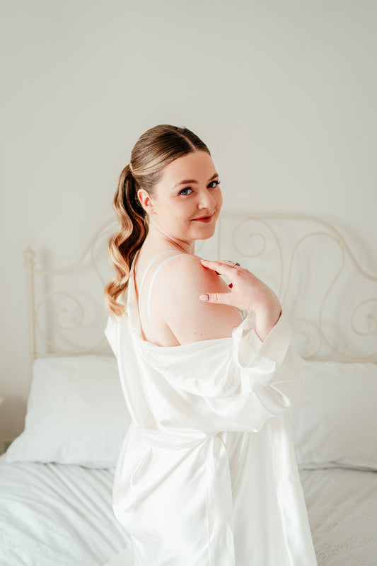 Are you looking for luxurious, fresh, white bridal lingerie for you big day? Look no further than the Vivienne range. White florals dance across the body while strappy, adjustable detailing hugs your figure in all the right places. Comfy wedding underwear has never looked so good! Pair with our signature silk bridal garter to complete the look.