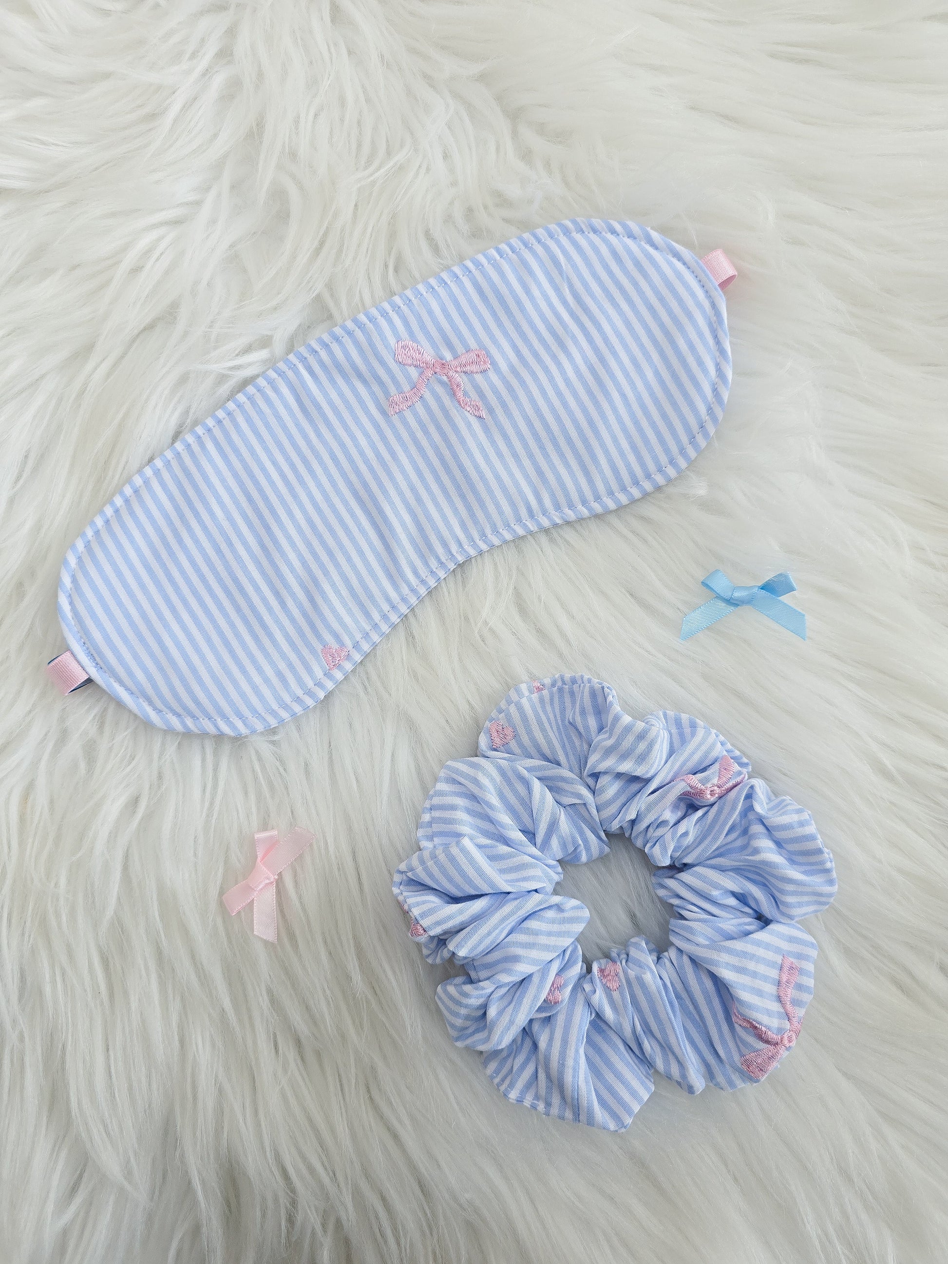At Miss V, we understand how important self care is! Treat yourself or a loved one to our cute, cotton Anna Eyemask and Scrunchie Gift Set. Made from soft and buttery 100% cotton, embroidered pink bows and hearts are scattered across fresh blue and white pin stripes.