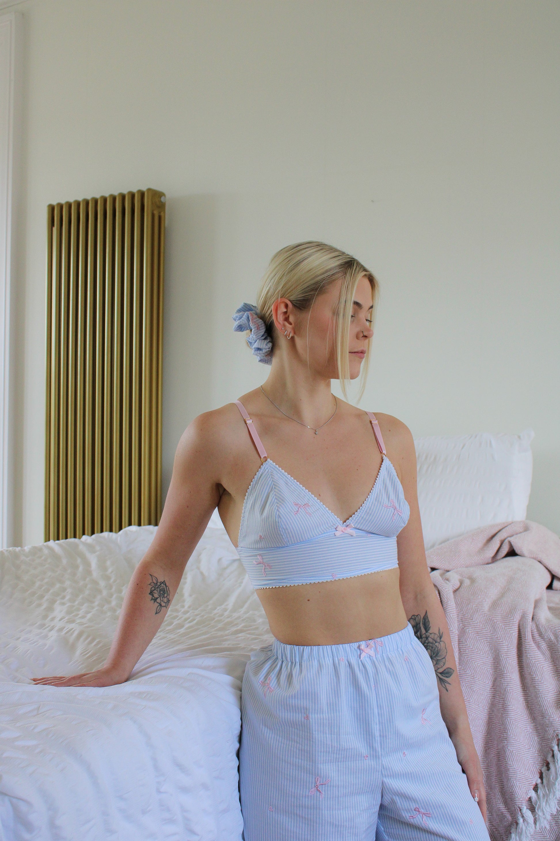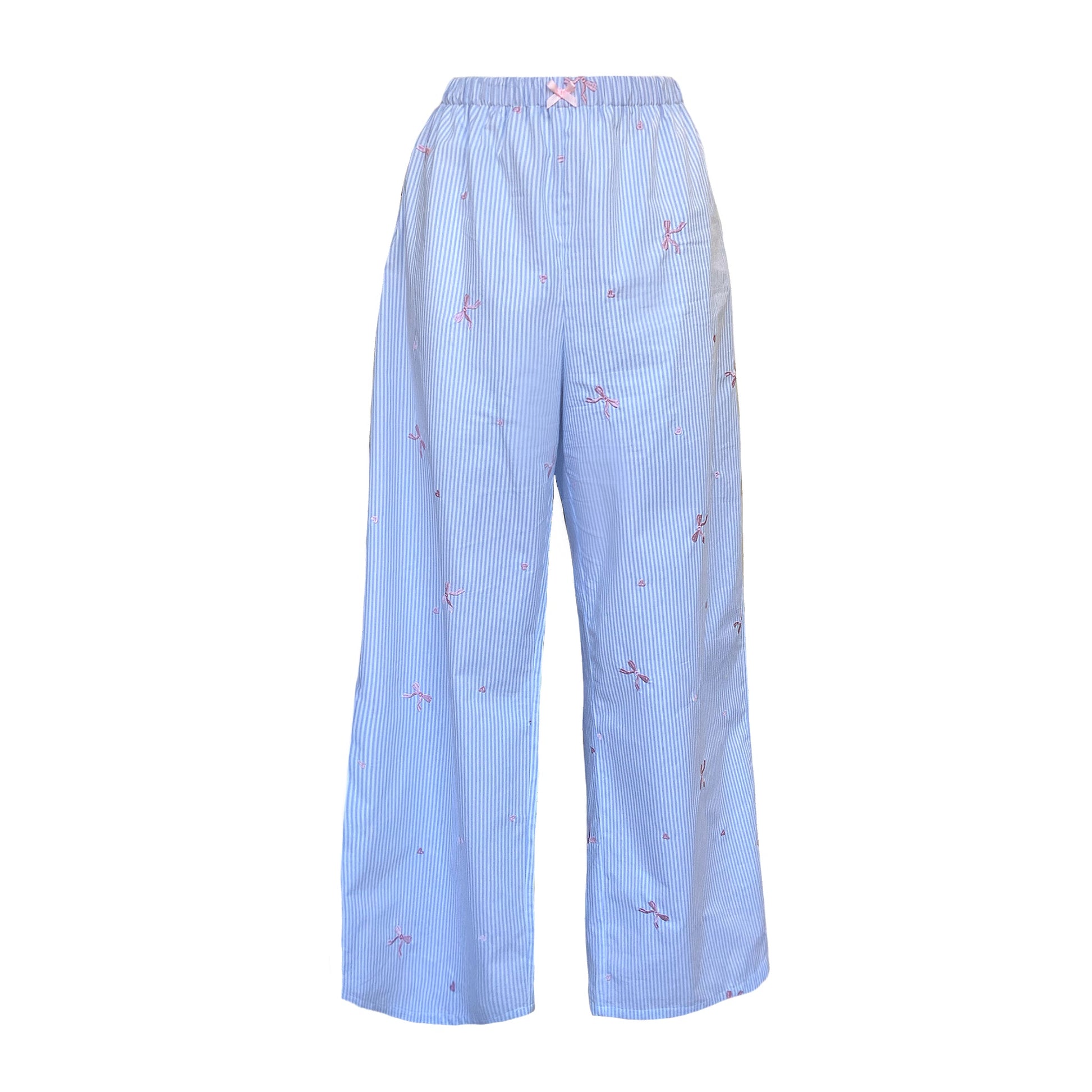 Lounge in the comfort of our cosy, cotton Anna loungewear range. These high waisted trousers are crafted from soft and buttery 100% cotton. Embroidered pink bows and hearts are scattered across fresh blue and white pin stripes. Pair with the Anna Cami or Bralette for the perfect sleepwear combo.