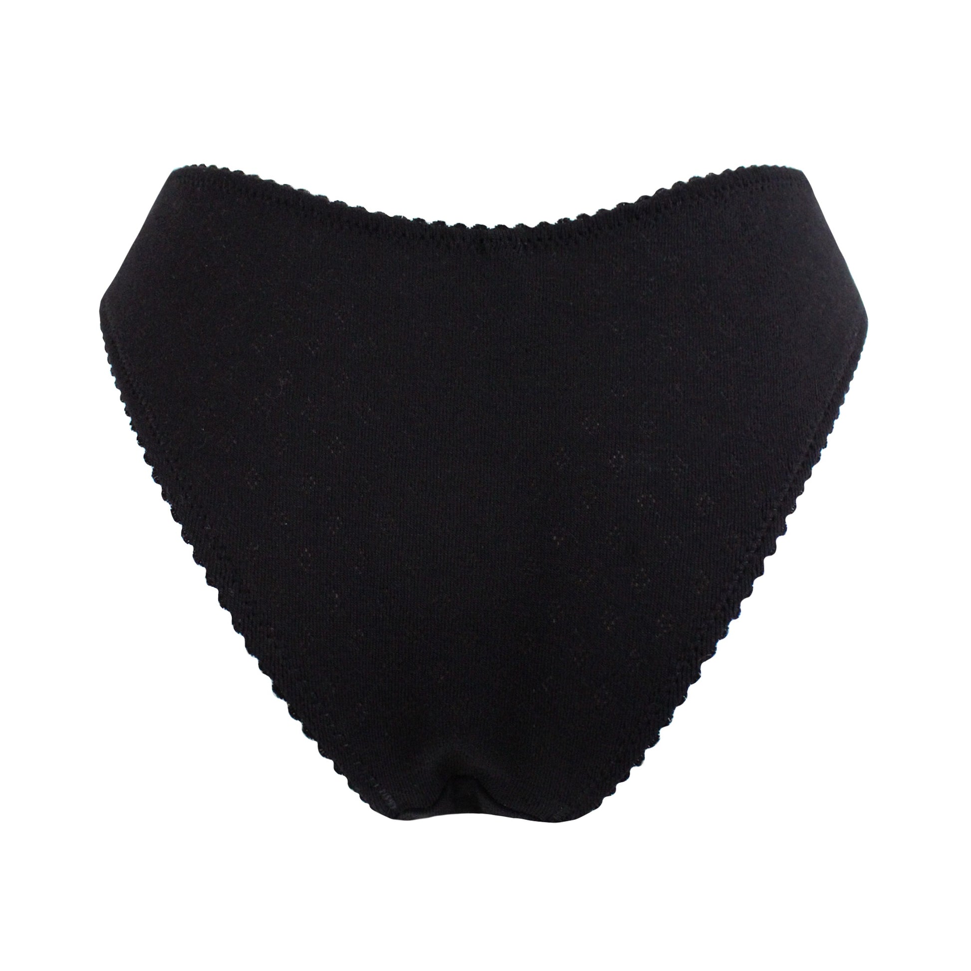 Elevate your everyday lingerie with the Beth range. Buttery soft, black cotton pointelle jersey lays flat against the body, perfect for daily wear. Featuring plush black elastic and an organic cotton gusset, this flattering high leg piece is both comfortable and cute! Pair with the Beth Cami for the perfect classic black loungewear set.