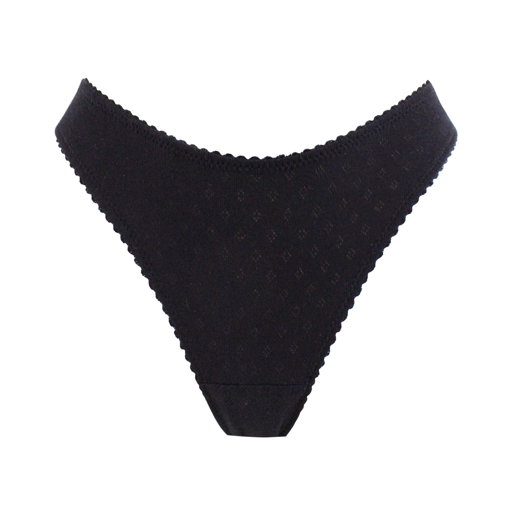 Elevate your everyday lingerie with the Beth range. Buttery soft, black cotton pointelle jersey lays flat against the body, perfect for daily wear. Featuring plush black elastic and an organic cotton gusset, this flattering high leg piece is both comfortable and cute! Pair with the Beth High Neck or Crossover Bralette for the perfect classic black set.