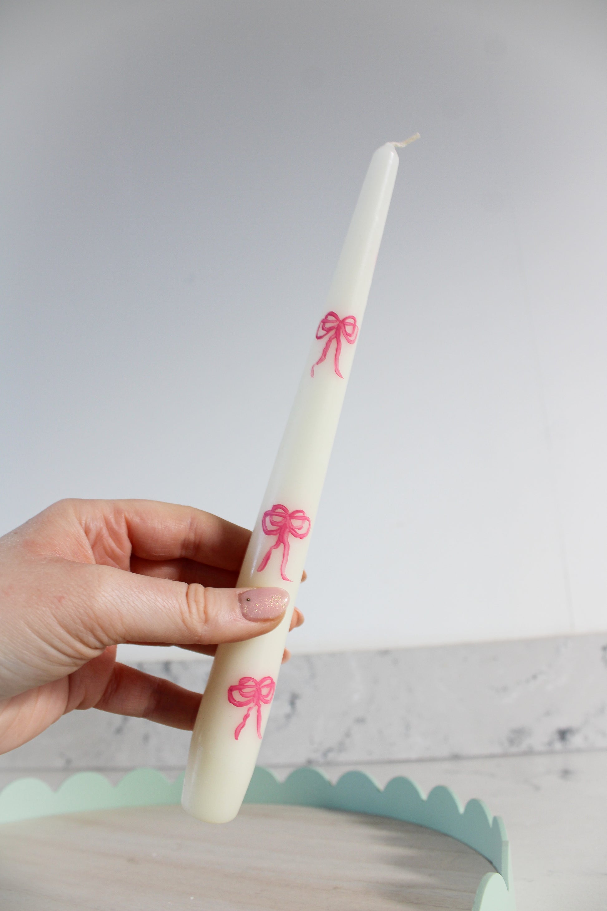 Discover our enchanting Bow Tapered Candles, a dinner candle in a natural wax colour adorned with delicate hand-painted pink bows. Carefully crafted with ethically sourced, eco and vegan friendly inredients, these fragrance-free candles offer a pure and simple elegance that complements any decor. Ideal for creating a romantic ambiance, these timeless pieces seamlessly align with Miss Vivienne's commitment to style and sustainability.