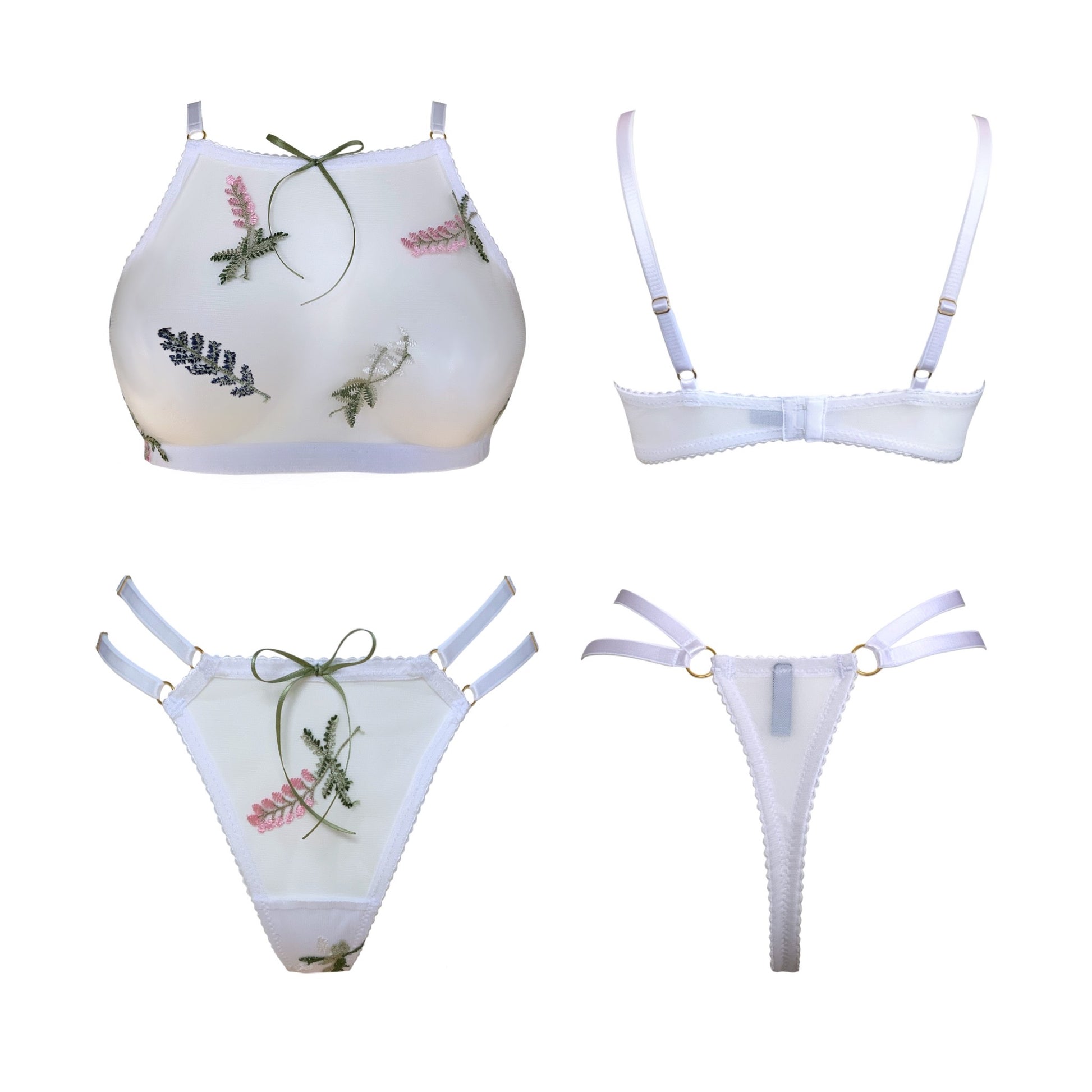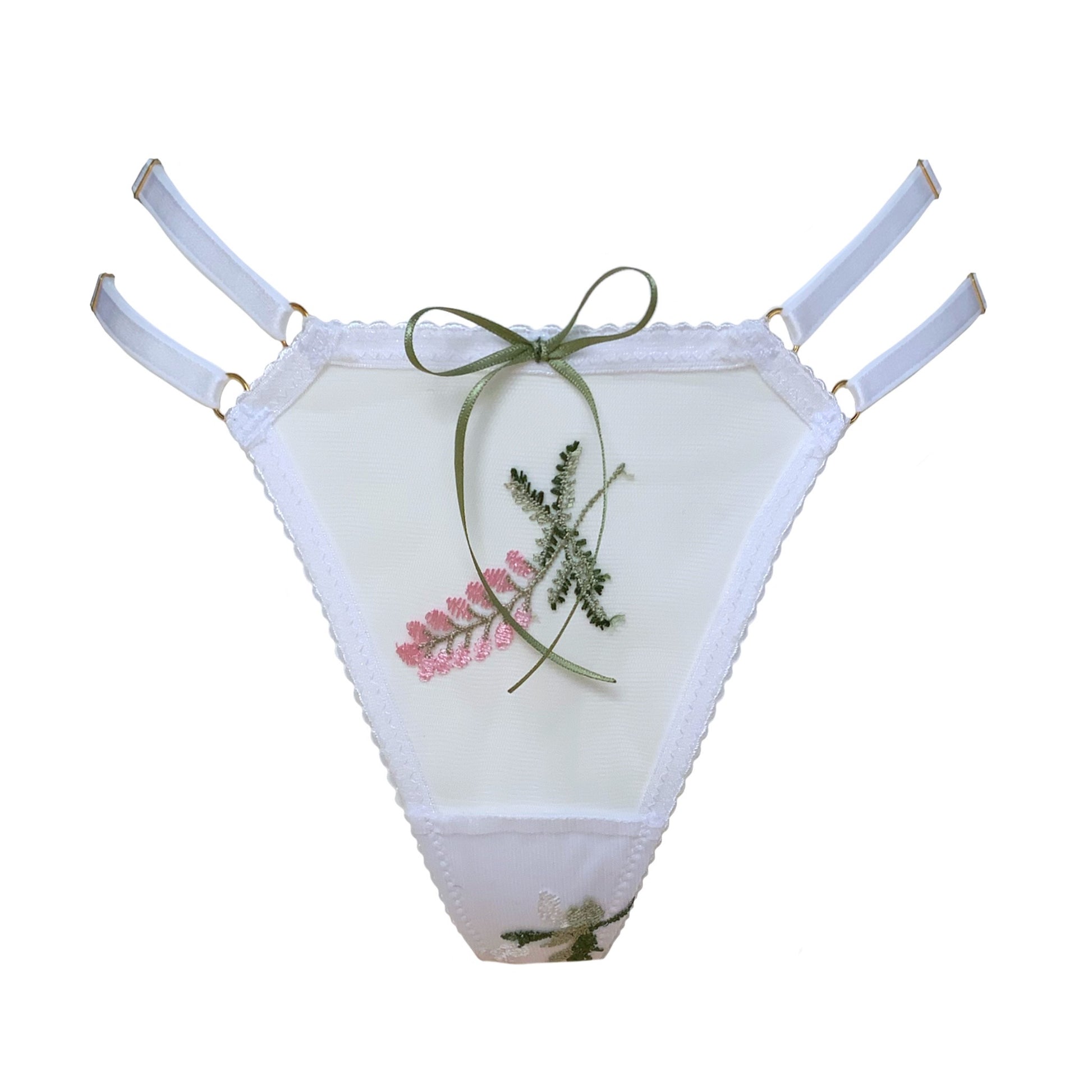 Spring has well and truly sprung with Heather, this months drop from Miss V! Dainty and fresh florals are embroidered onto fine tulle and paired with our signature 24K gold plated hardware. Each side strap on our iconic 2 Strap Thong is fully adjustable to fit and the piece is finished with a delicate green satin bow. Pair with the Heather Suspender Skirt and Balcony Bra to create the perfect spring time ensemble.