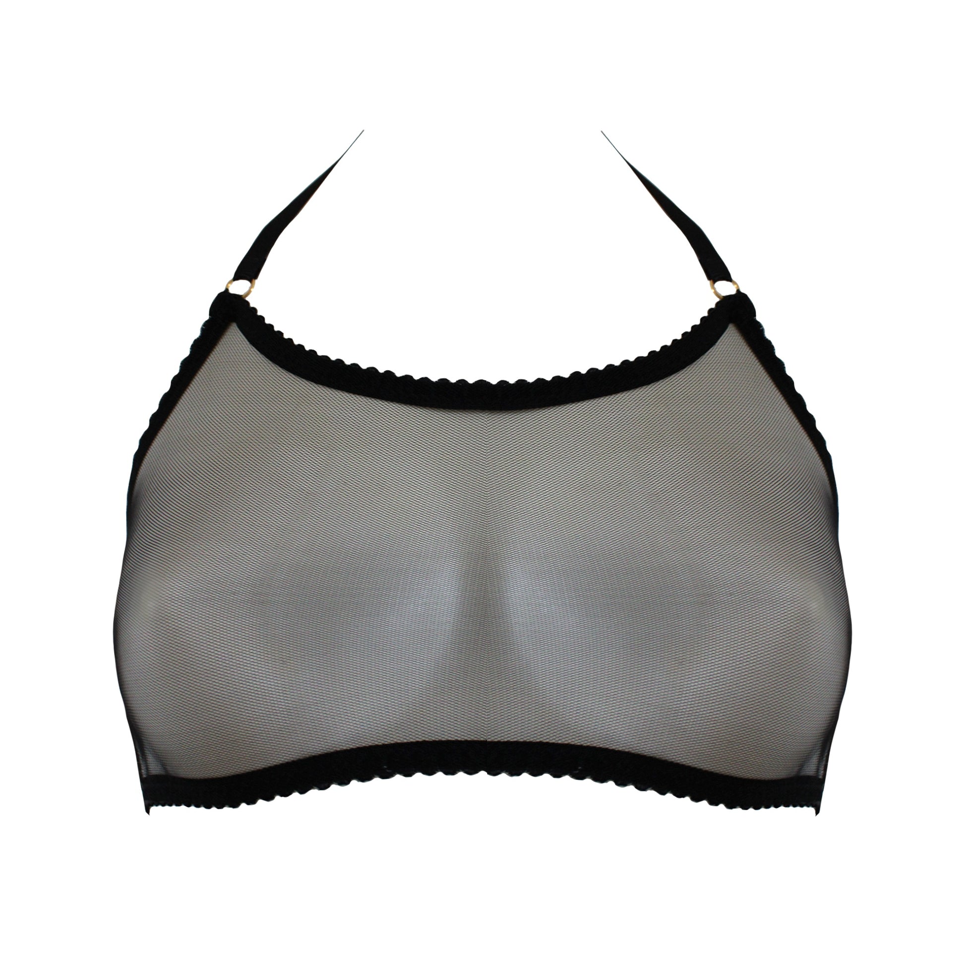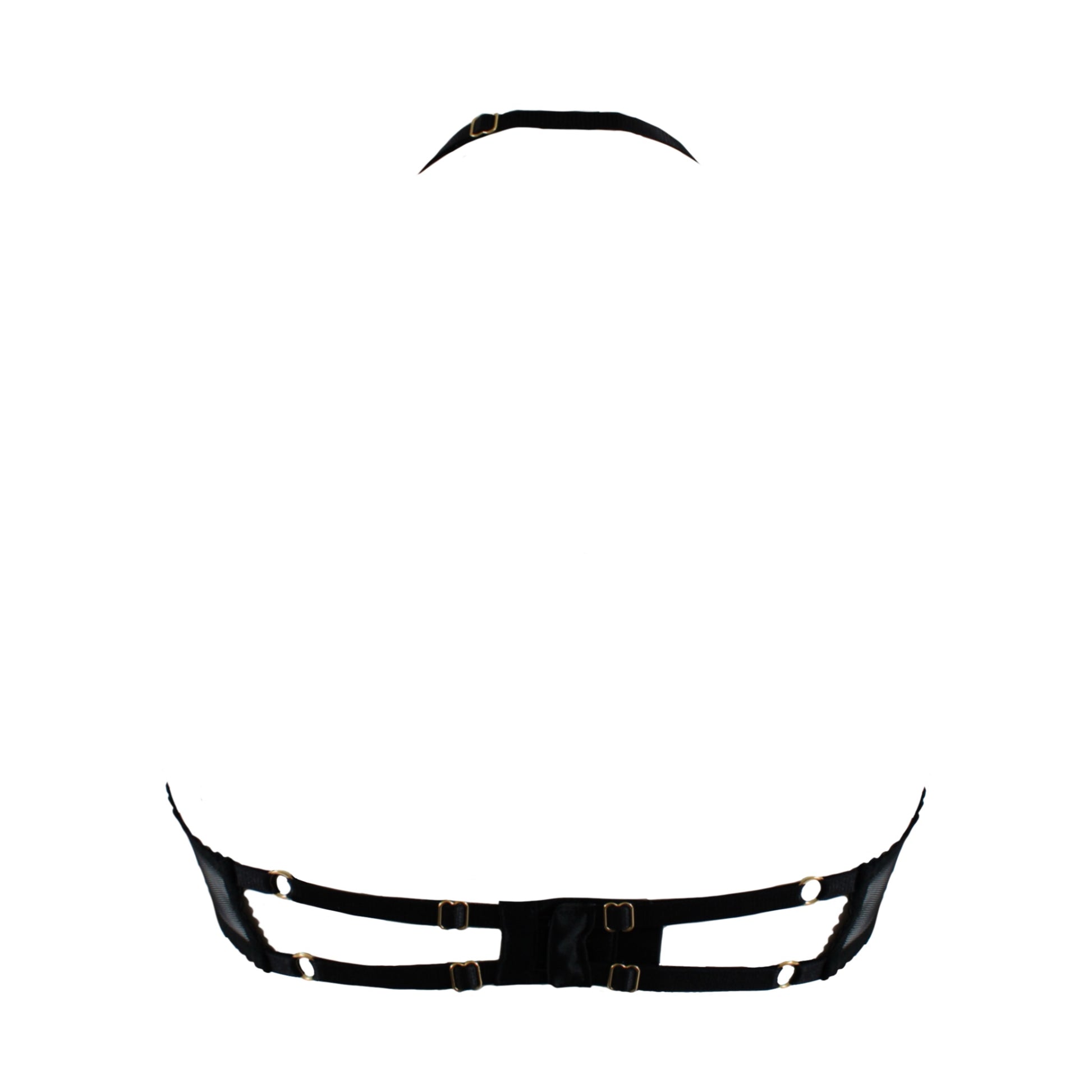 Elevate your everyday lingerie with the Jilly range. Soft, black sheer tulle lays flat against the body, perfect for daily wear. This unique piece features a halter neck and beautiful back strap detailing. Fasten at the back with swan hooks and adjust all strapping to fit comfortably. Our iconic gold hardware is 24K gold plated for the ultimate long lasting luxury lingerie experience. Pair with the Jilly Thong and Suspender to create the perfect classic black set!