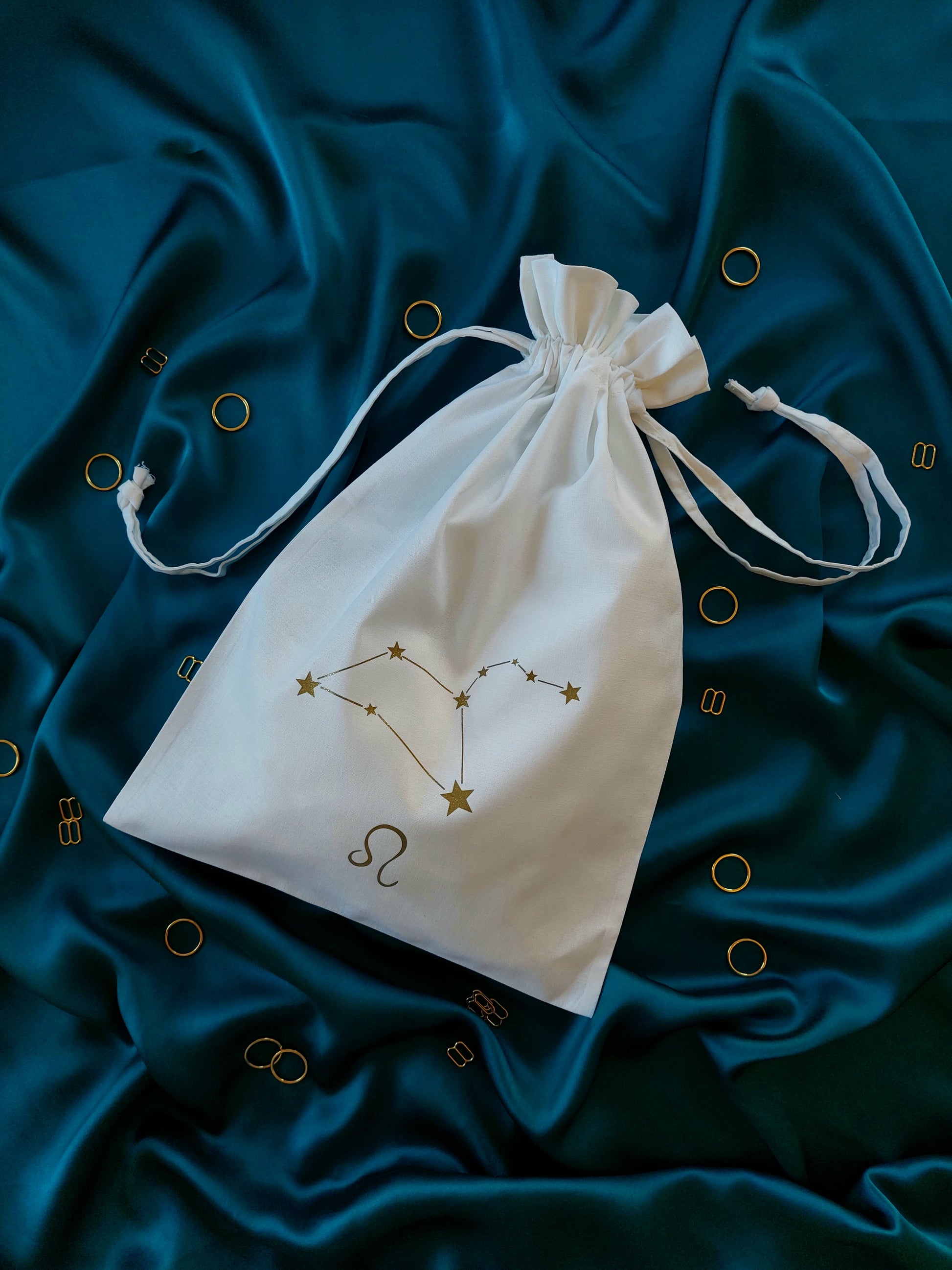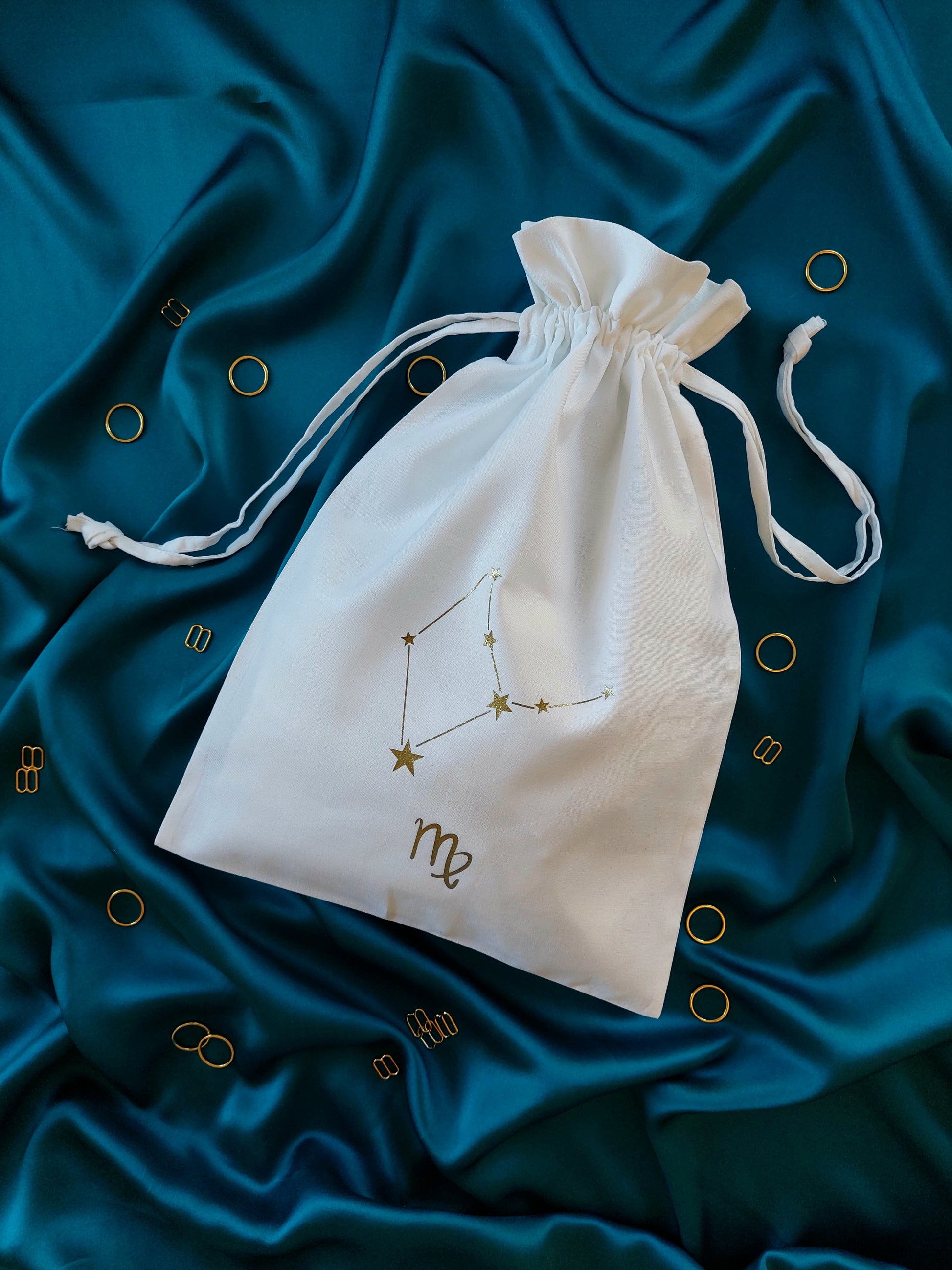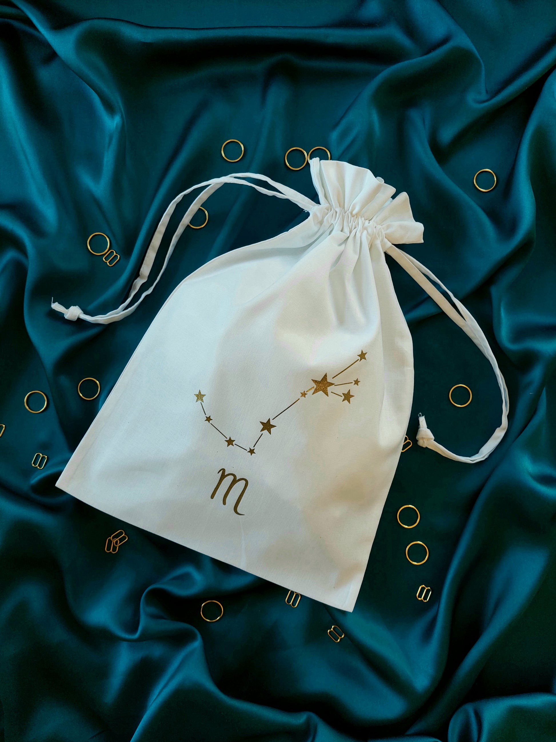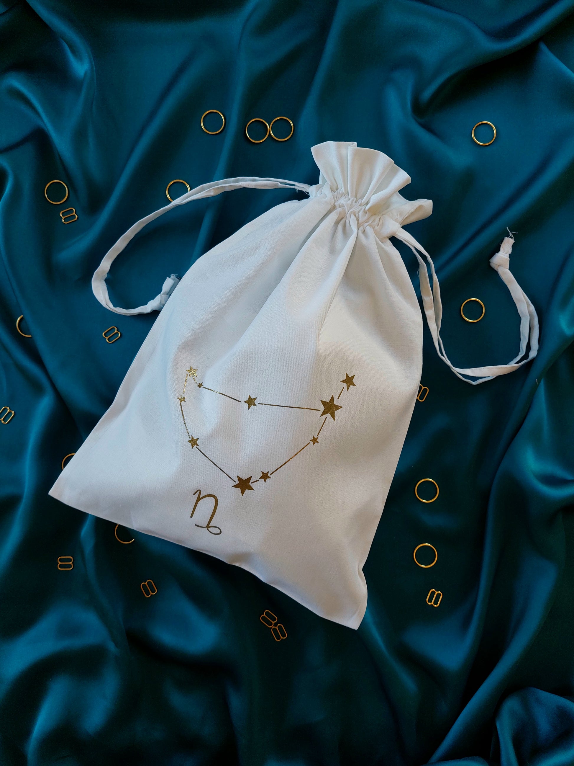 This cotton drawstring dustbag is perfect for keeping your lingerie in tip top condition. Printed in house with your very own star sign and constellation, it is both practical and pretty! A beautiful lingerie drawer accessory and a handy travel companion, it's the perfect little add on to your luxury purchase. The medium size storage bag will comfortably fit up to four or five pieces including our underbust corsets!