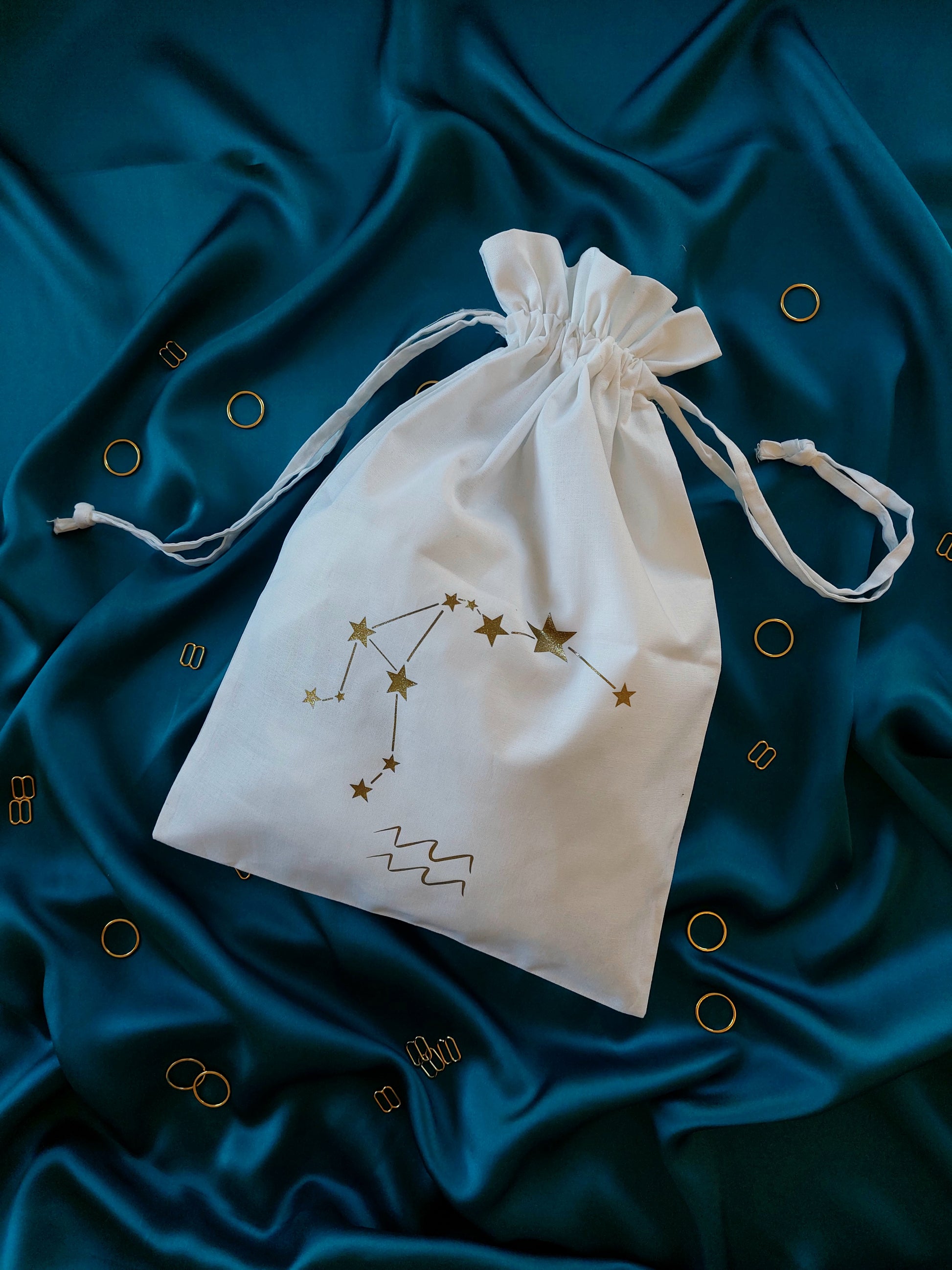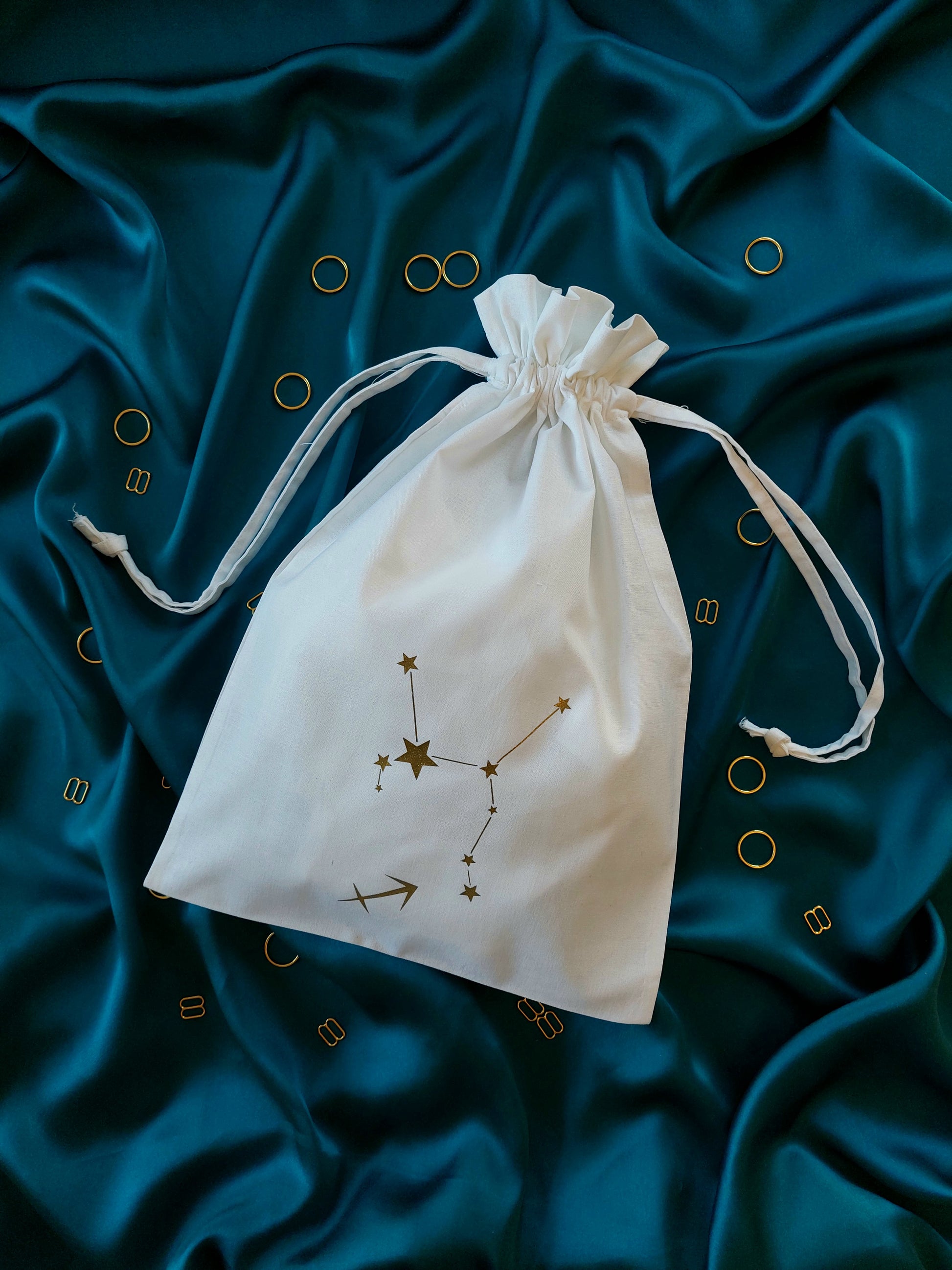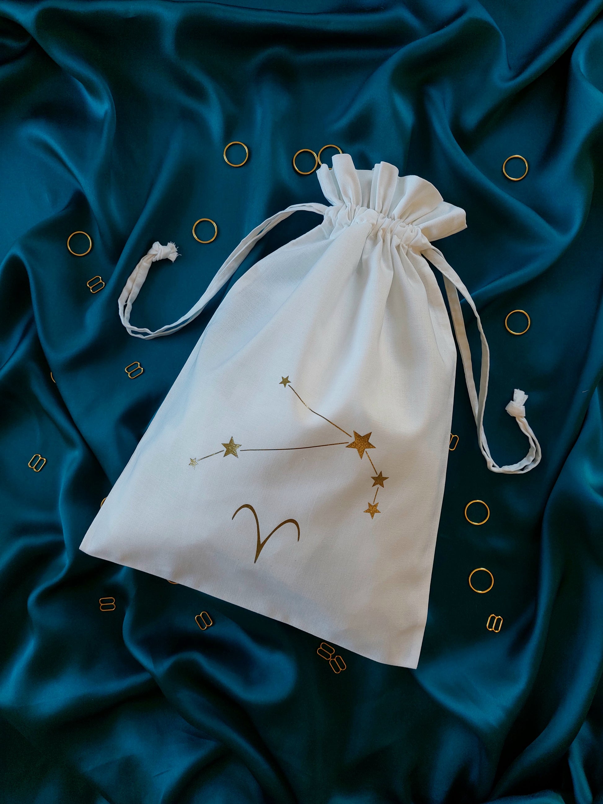 This cotton drawstring dustbag is perfect for keeping your lingerie in tip top condition. Printed in house with your very own star sign and constellation, it is both practical and pretty! A beautiful lingerie drawer accessory and a handy travel companion, it's the perfect little add on to your luxury purchase. The medium size storage bag will comfortably fit up to four or five pieces including our underbust corsets!