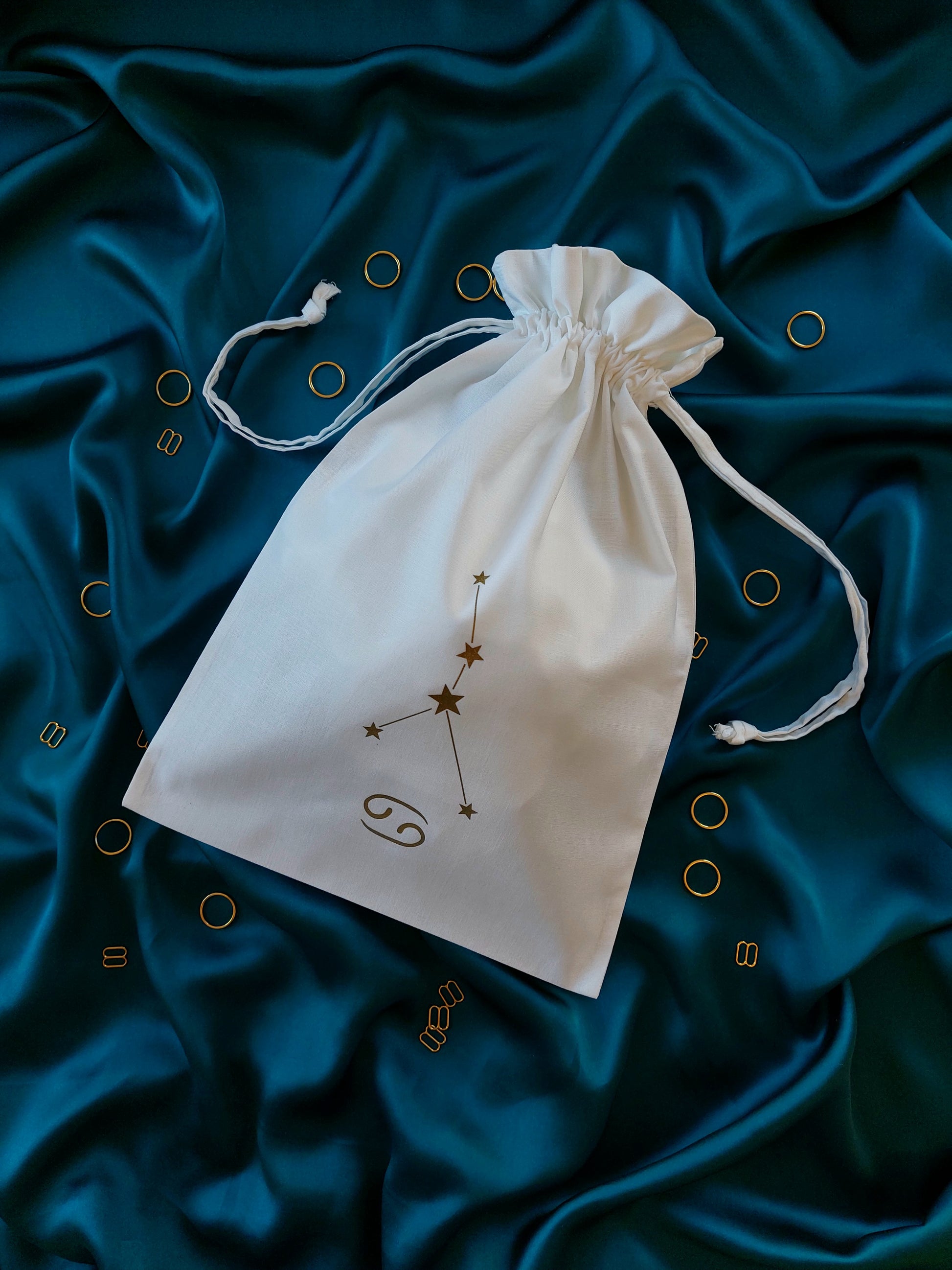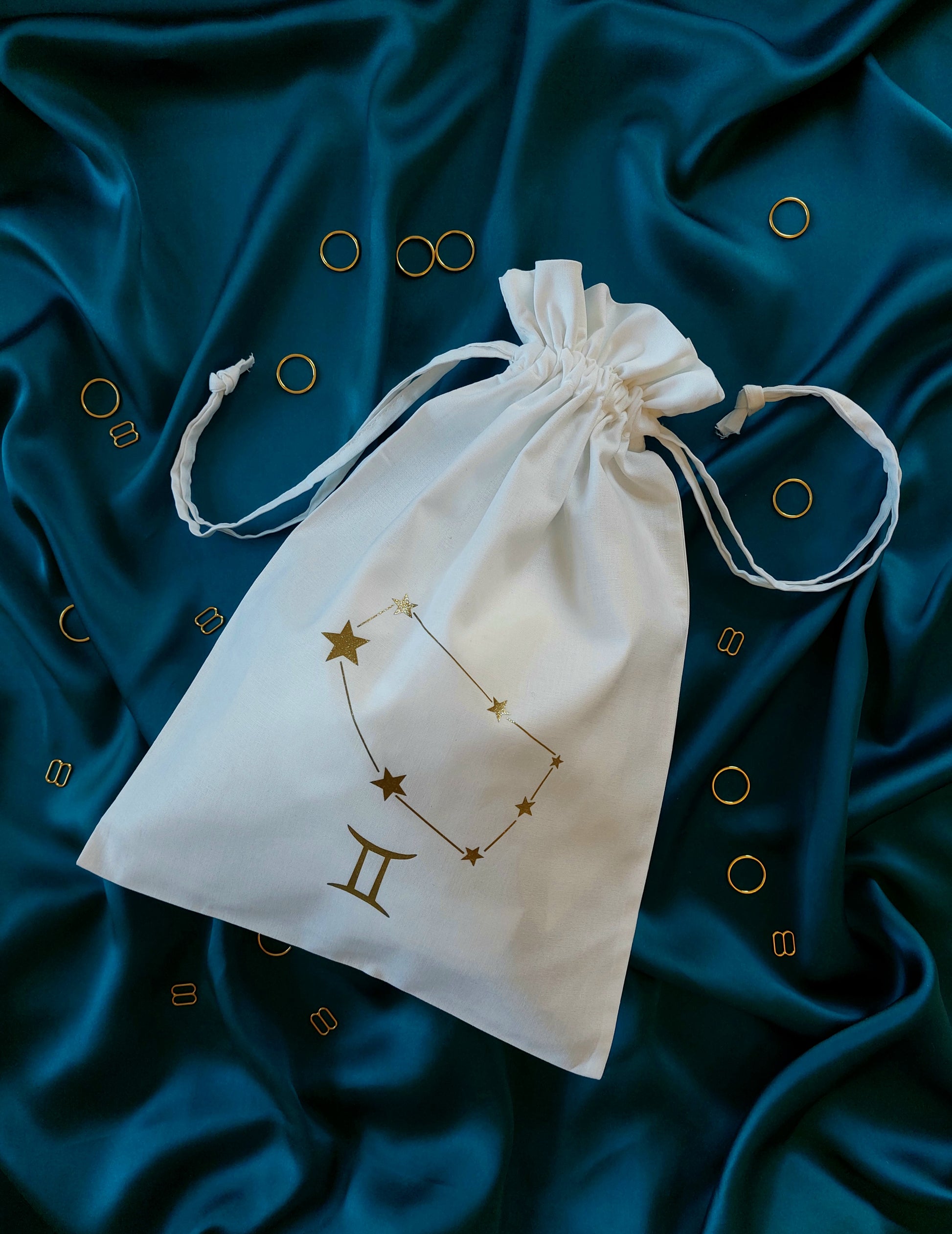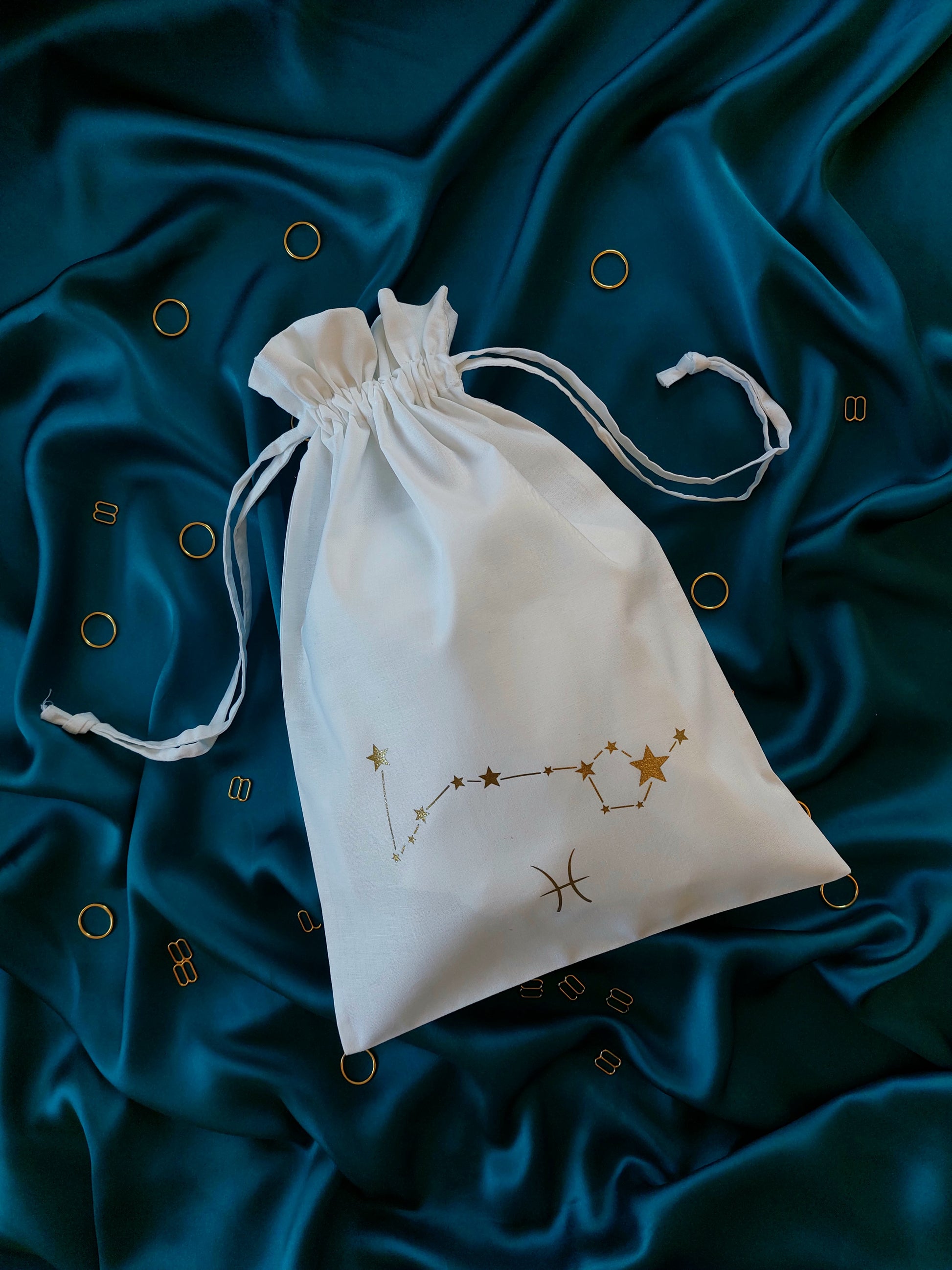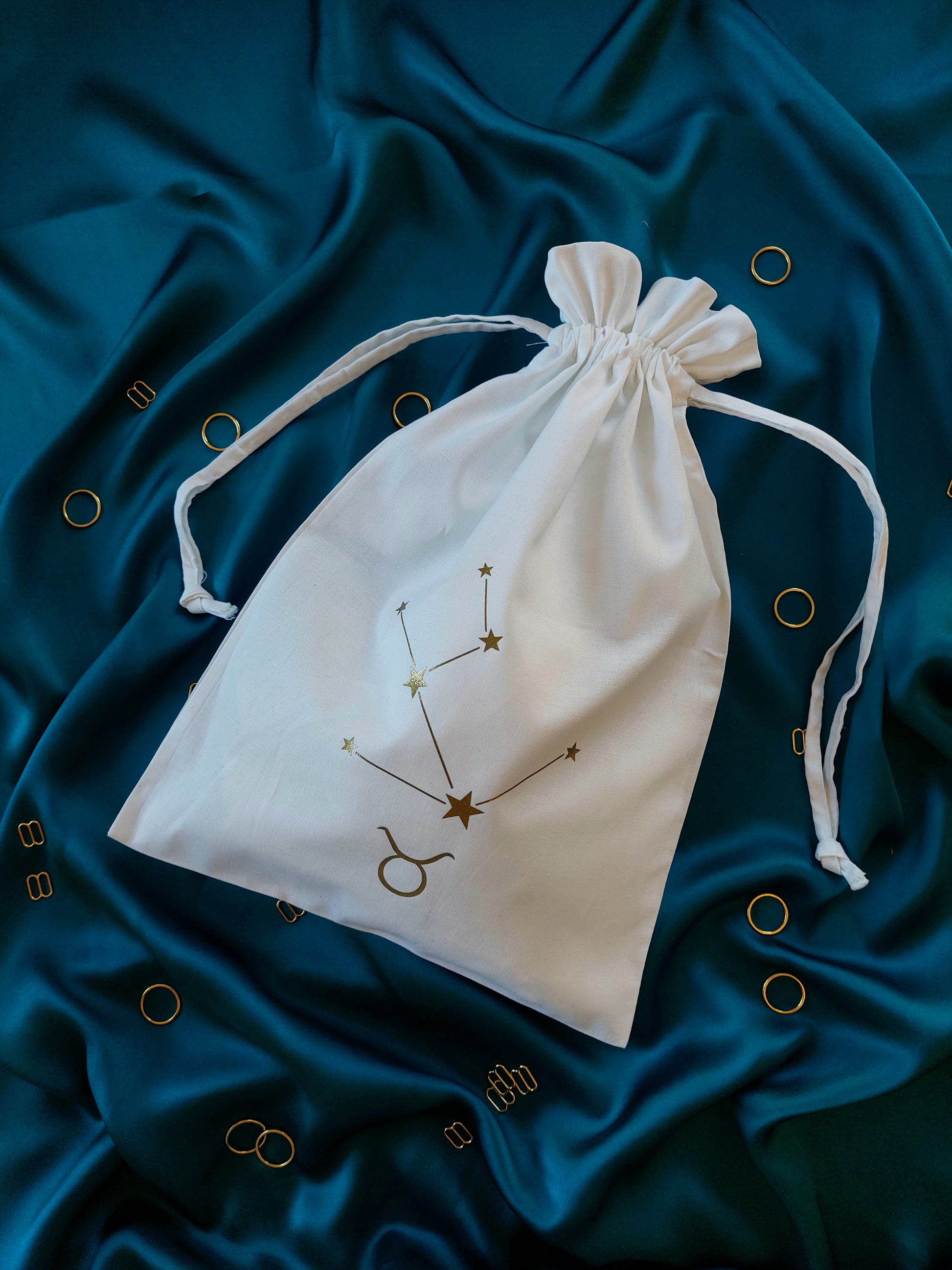 This cotton drawstring dustbag is perfect for keeping your lingerie in tip top condition. Printed in house with your very own star sign and constellation, it is both practical and pretty! A beautiful lingerie drawer accessory and a handy travel companion, it's the perfect little add on to your luxury purchase. The medium size storage bag will comfortably fit up to four or five pieces including our underbust corsets!